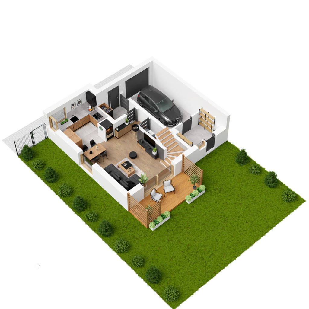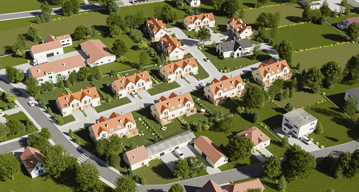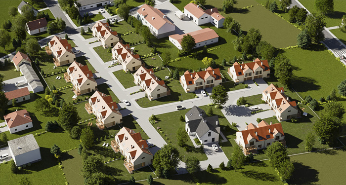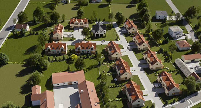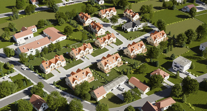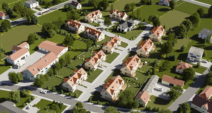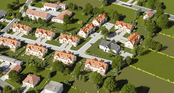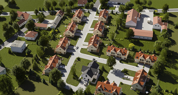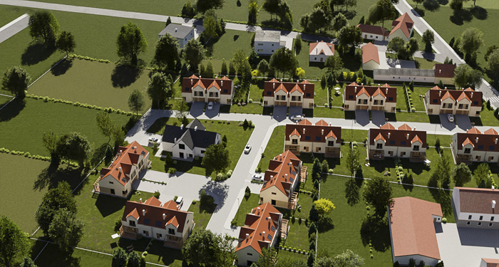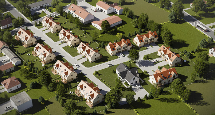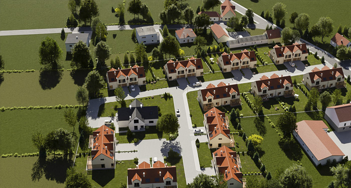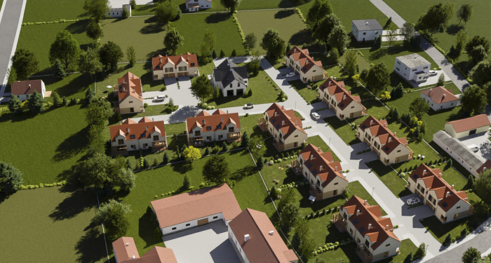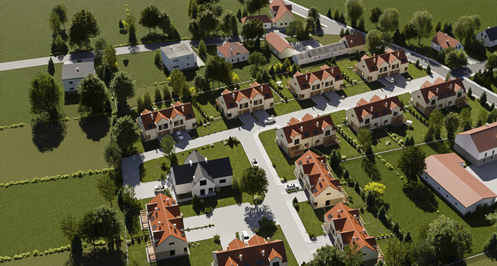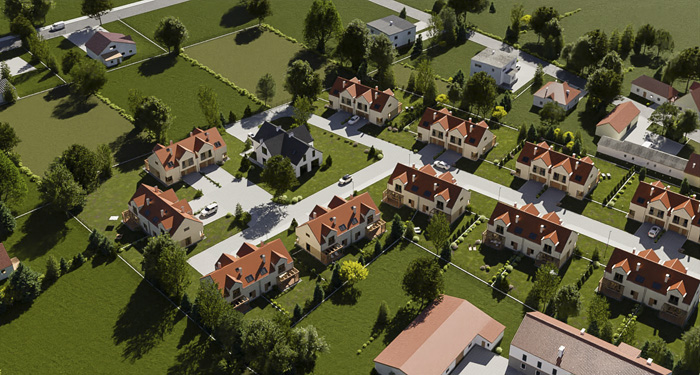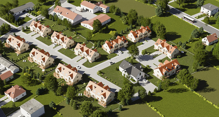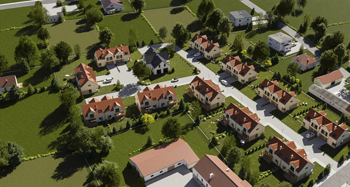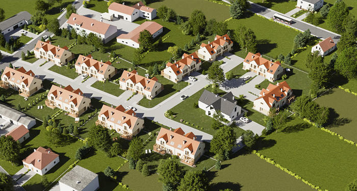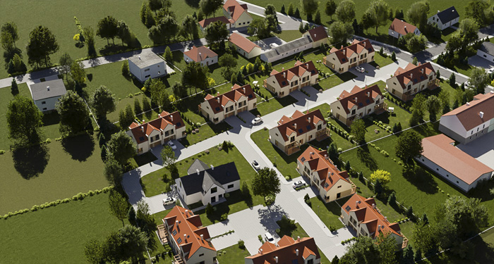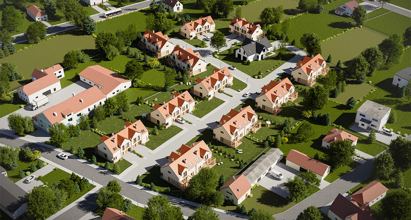 Kameralne osiedle 24 domów w zabudowie bliźniaczej, z których każdy ma powierzchnię użytkową 130,92 m² i doskonale zaprojektowany układ pomieszczeń.